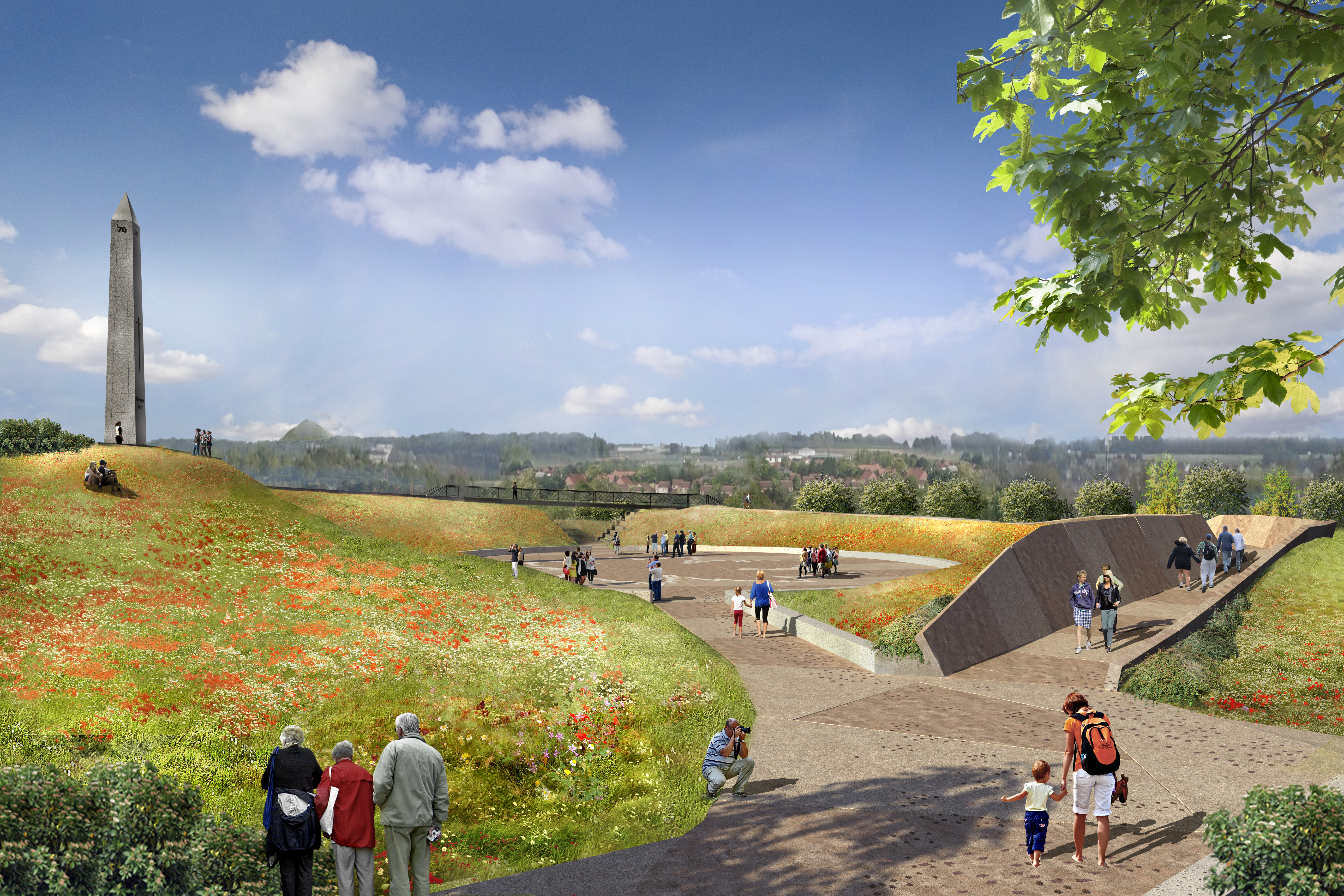Le parc se situe près de la ligne de départ du Corps canadien, d’où celui-ci a commencé l’attaque vers Cote 70. Le site actuel est 1.4 km à l’est. Le parc est composé d’éléments divers. En quittant le centre de réception, on commence la montée graduelle le long d’un chemin courbé. Le chemin lui-même est doté de 1877 gravures de feuilles d’érables canadiennes, dont chacune représente un soldat canadien qui a perdu la vie pour la victoire à Cote 70. Plus loin, le chemin joint l’amphithéâtre Arthur Currie. Ici, on a le choix d’entrer dans l’amphithéâtre ou de suivre le chemin Frederick Lee, menant au-delà de la tranchée, jusqu’au sommet et finalement à l’obélisque. Celui-ci est un élément clef du site mémorial de Cote 70. Donnant sur le site au complet, d’une hauteur de 70m au-dessus du niveau de la mer, l’obélisque en pierre comporte une gravure de l’épée de sacrifice, ainsi que les mots CANADA 1917. Sa partie supérieure, se terminant en pointe, a une longueur égale à la hauteur moyenne du soldat canadien de l’époque de la Grande guerre. Cette section représente les soldats du Corps canadien de la Première Guerre mondiale. Immédiatement en bas de l’obélisque, l’amphithéâtre est un point central d’assemblée pour les visiteurs et les groupes guidés.